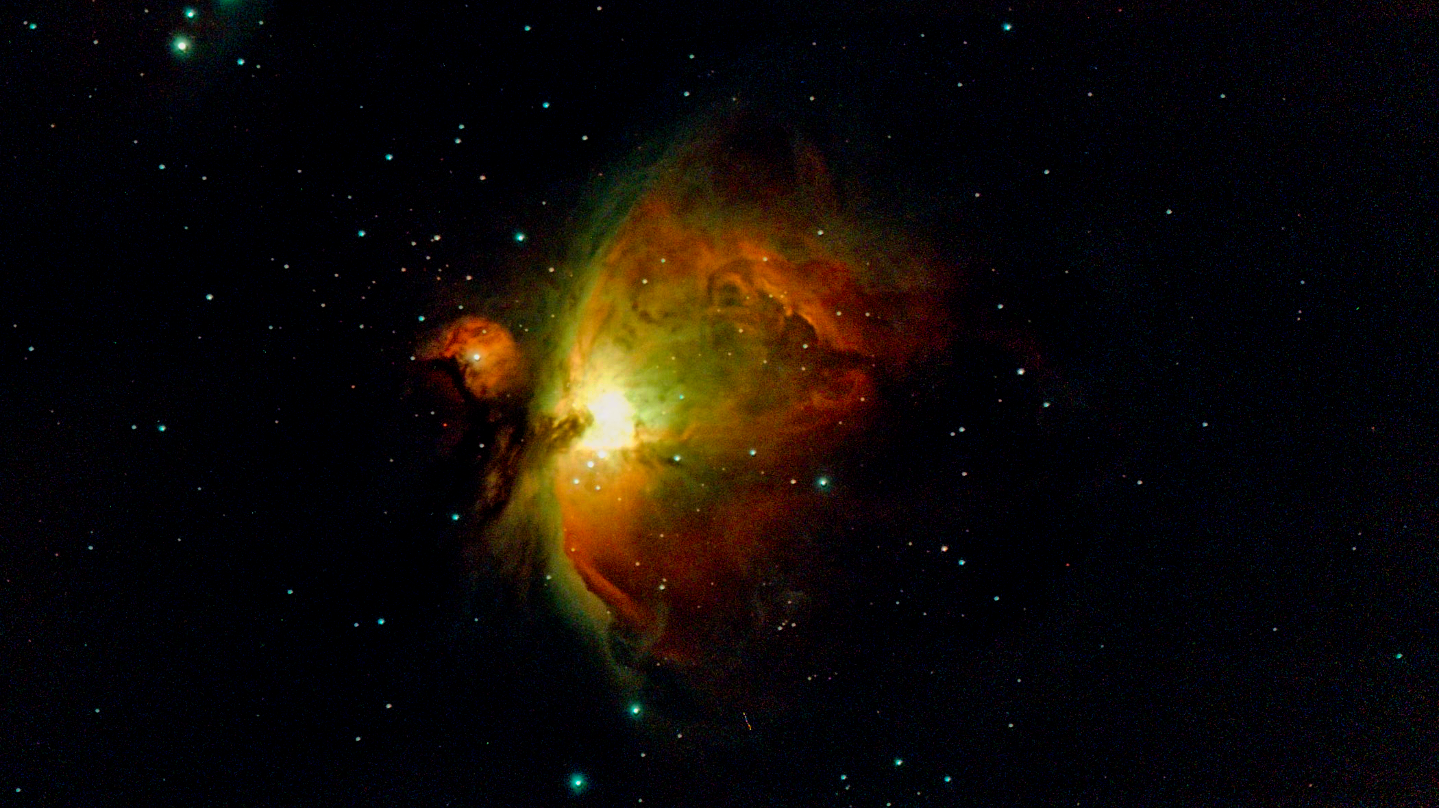 The Orion Nebula (also known as Messier 42, M42, or NGC 1976) is a diffuse nebula in the Milky Way situated south of Orion's Belt in the constellation of Orion,[b] and is known as the middle "star" in the "sword" of Orion. It is one of the brightest nebulae and is visible to the naked eye in the night sky with an apparent magnitude of 4.0. It is 1,344 ± 20 light-years away and is the closest region of massive star formation to Earth. M42 is estimated to be 25 light-years across. It has a mass of about 2,000 times that of the Sun. Older texts frequently refer to the Orion Nebula as the Great Nebula in Orion or the Great Orion Nebula. The Orion Nebula is one of the most scrutinized and photographed objects in the night sky and is among the most intensely studied celestial features. The nebula has revealed much about the process of how stars and planetary systems are formed from collapsing clouds of gas and dust. Astronomers have directly observed protoplanetary disks and brown dwarfs within the nebula, intense and turbulent motions of the gas, and the photo-ionizing effects of massive nearby stars in the nebula.