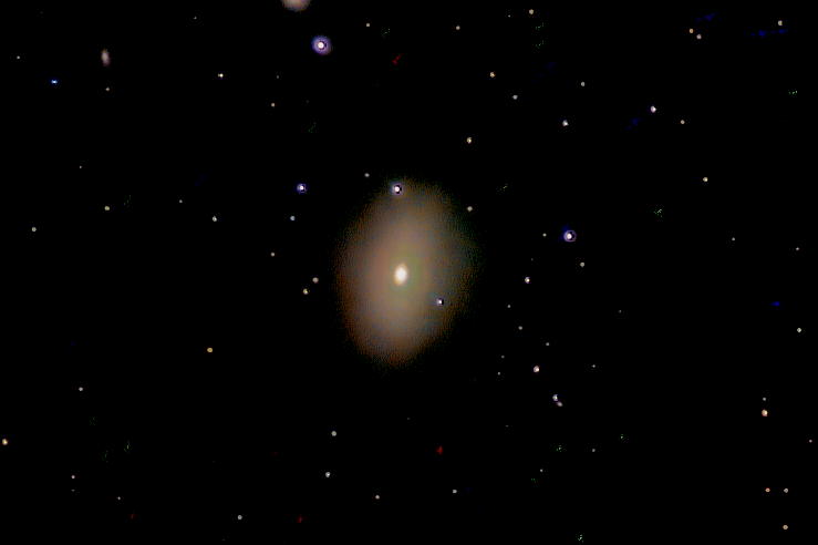 Messier 59, also known as NGC 4621, is an elliptical galaxy in the equatorial constellation of Virgo. It is a member of the Virgo Cluster, with the nearest fellow member 8' away and around 5 magnitudes fainter. The nearest cluster member of comparable brightness is the lenticular galaxy NGC 4638, which is around 17' away. It and the angularly nearby elliptical galaxy Messier 60 were both discovered by Johann Gottfried Koehler in April 1779 when observing comet seeming close by. Charles Messier listed both in the Messier Catalogue about three days after Koehler's discovery. This is an elliptical galaxy of type E5 with a position angle of 163.3°, indicating the overall shape shows a flattening of 50%. However, isophotes for this galaxy deviate from a perfect ellipticity, showing pointed shapes instead. These can be decomposed mathematically into a three component model, with each part having a different eccentricity. The main elliptical component appears to be superimposed upon a flatter, disk-like feature, with the entirety embedded within a circular halo. The luminosity contribution of the components is 62% for the pure elliptical part, 22% for the halo, and the remainder coming from the disk. The light ratio of the disk to the main elliptical body is 0.25, whereas it is typically closer to 0.5 in a lenticular galaxy. The core contains a supermassive black hole (SMBH), with a mass that has been estimated to be 270 million times the mass of the Sun, and counter-rotates with respect of the rest of the galaxy, being bluer. The SMBH is quiescent, but is detectable as an X-ray and radio source that indicates an outflow. The nucleus contains an embedded stellar disk that is bluer (younger) than the bulge region, with a blue component stretching along a position angle of around 150°. This extended disk feature may be the result of a galactic merger followed by a starburst event. Messier 59 is very rich in globular clusters, with a population of them that has been estimated to be around 2,200. It has two satellites, the ultra compact dwarf galaxy M59-UCD3 and M59cO, which is a rare example of a galaxy in between compact ellipticals such as Messier 32 and ultra compact dwarfs.