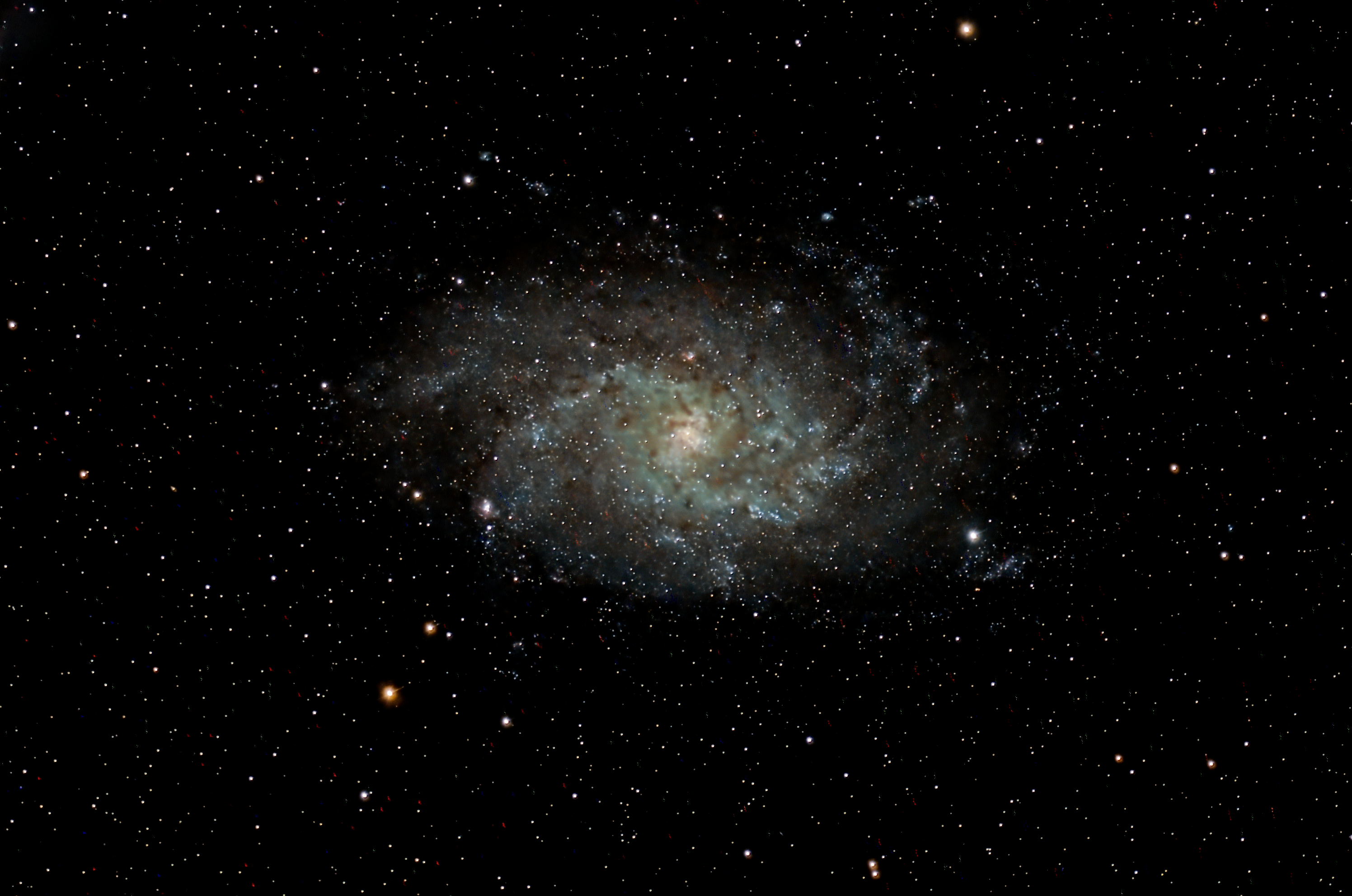 The Pinwheel Galaxy (also known as Messier 101, M101 or NGC 5457) is a face-on, counterclockwise Intermediate spiral galaxy located 21 million light-years from Earth in the constellation Ursa Major. It was discovered by Pierre Méchain in 1781 and was communicated that year to Charles Messier, who verified its position for inclusion in the Messier Catalogue as one of its final entries. M101 is a large galaxy, with a diameter of 252,000 light-years. By comparison, the Milky Way has a diameter of 87,400 light-years. It has around a trillion stars. It has a disk mass on the order of 100 billion solar masses, along with a small central bulge of about 3 billion solar masses. Its characteristics can be compared to those of Andromeda Galaxy. M101 has a high population of H II regions, many of which are very large and bright. H II regions usually accompany the enormous clouds of high density molecular hydrogen gas contracting under their own gravitational force where stars form. H II regions are ionized by large numbers of extremely bright and hot young stars; those in M101 are capable of creating hot superbubbles. In a 1990 study, 1,264 H II regions were cataloged in the galaxy. Three are prominent enough to receive New General Catalogue numbers—NGC 5461, NGC 5462, and NGC 5471. M101 is asymmetrical due to the tidal forces from interactions with its companion galaxies. These gravitational interactions compress interstellar hydrogen gas, which then triggers strong star formation activity in M101's spiral arms that can be detected in ultraviolet images. In 2001, the X-ray source P98, located in M101, was identified as an ultra-luminous X-ray source—a source more powerful than any single star but less powerful than a whole galaxy—using the Chandra X-ray Observatory. It received the designation M101 ULX-1. In 2005, Hubble and XMM-Newton observations showed the presence of an optical counterpart, strongly indicating that M101 ULX-1 is an X-ray binary. Further observations showed that the system deviated from expected models—the black hole is just 20 to 30 solar masses, and consumes material (including captured stellar wind) at a higher rate than theory suggests. It is estimated that M101 has about 150 globular clusters, the same as the number of the Milky Way's globular clusters. On February 28, 2006, NASA and the European Space Agency released a very detailed image of the Pinwheel Galaxy, which was the largest and most detailed image of a galaxy by Hubble Space Telescope at the time. The image was composed of 51 individual exposures, plus some extra ground-based photos. This is the second attempt in imaging M 101, the first image taken 06/17/25 with Origin for 30m.