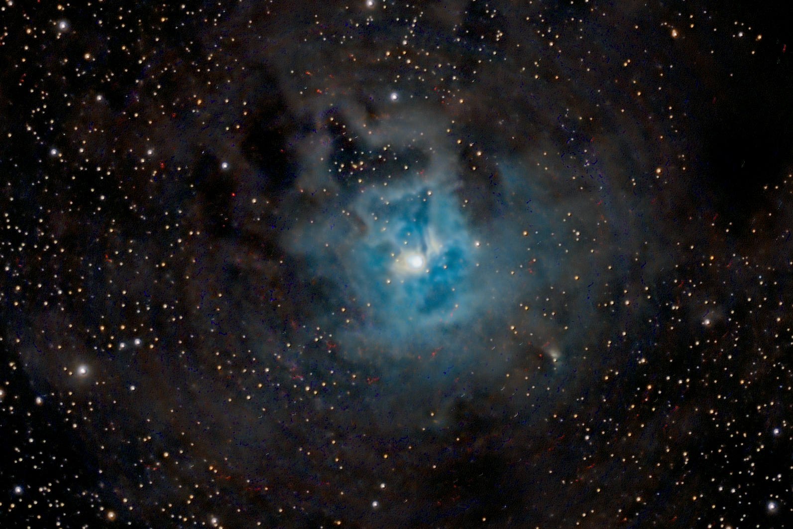 The Iris Nebula (also known as NGC 7023 and Caldwell 4) is a bright reflection nebula in the constellation Cepheus. The designation NGC 7023 refers to the open cluster within the larger reflection nebula designated LBN 487. The nebula, which shines at magnitude +6.8, is illuminated by a magnitude +7.4 star designated HD 200775. It is located near the Mira-type variable star T Cephei, and near the bright magnitude +3.23 variable star Beta Cephei (Alfirk). It lies 1,300 light-years away and is six light-years across. First image retrieved 06/05/2025 with Origin at 45m