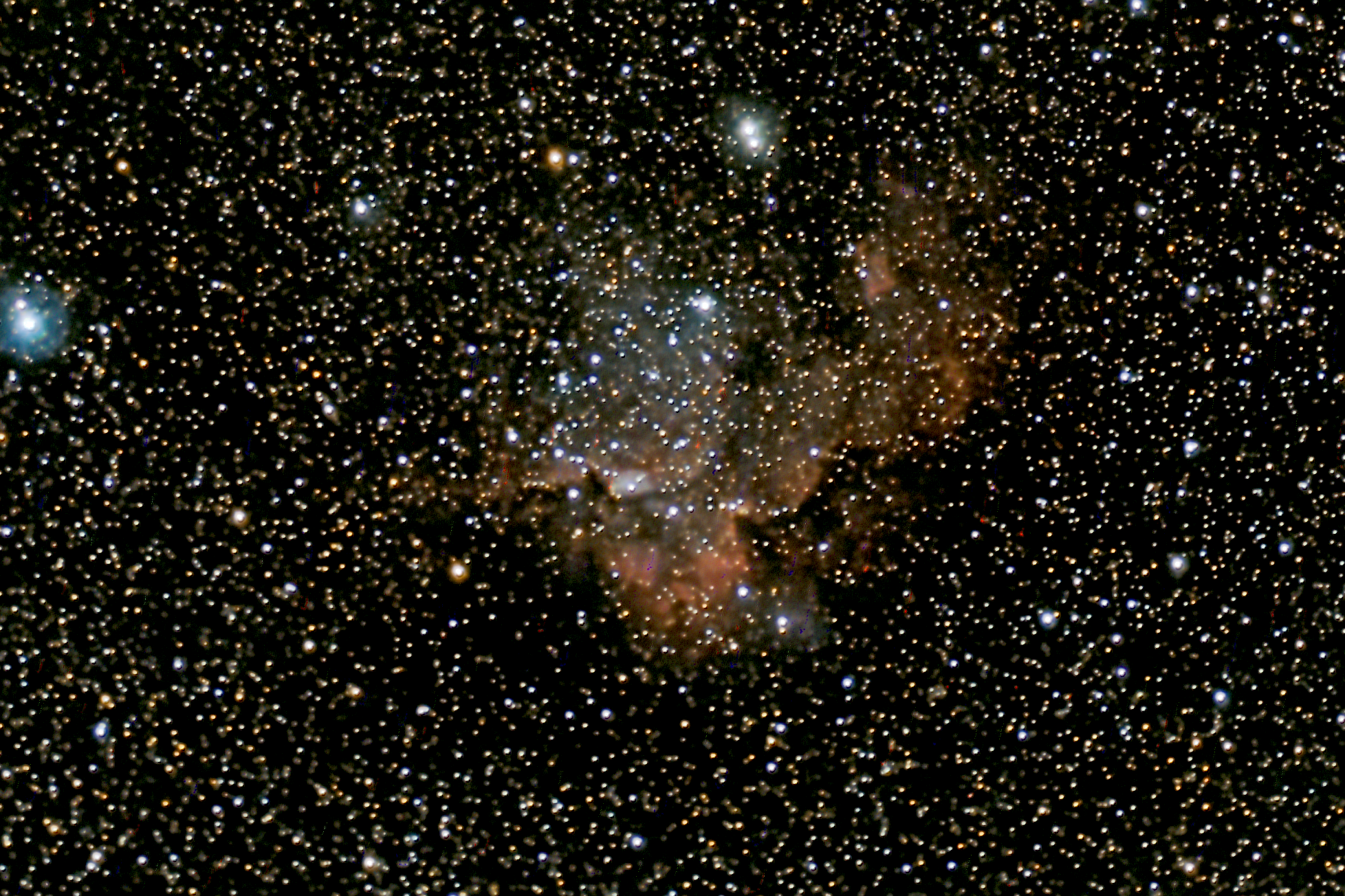 NGC 7380 is a young open cluster of stars in the northern circumpolar constellation of Cepheus, discovered by Caroline Herschel in 1787. The surrounding emission nebulosity is known colloquially as the Wizard Nebula, which spans an angle of 25'. German-born astronomer William Herschel included his sister's discovery in his catalog, and labelled it H VIII.77. The nebula is known as S 142 in the 1959 Sharpless catalog (Sh2-142). It is extremely difficult to observe visually, usually requiring very dark skies and an O-III filter. The NGC 7380 complex is located at a distance of approximately 8.5K light-years from the Sun, in the Perseus Arm of the Milky Way. The cluster spans about 20 light-years (6 pc) with an elongated shape and an extended tail. Age estimates range from 4 to 11.9 million years. At the center of the cluster lies DH Cephei, a close, double-lined spectroscopic binary system consisting of two massive O-type stars. This pair are the primary ionizing source for the surrounding H II region, and are driving out the surrounding gas and dust while triggering star formation in the neighboring region. Of the variable stars that have been identified in the cluster, 14 have been identified as pre-main sequence stars while 17 are main sequence stars that are primarily B-type variables.