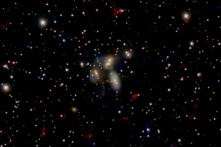 Stephan's Quintet is a visual grouping of five galaxies of which four form the first compact galaxy group ever discovered. The group, visible in the constellation Pegasus, was discovered by Édouard Stephan in 1877 at the Marseille Observatory. The group is the most studied of all the compact galaxy groups. The brightest member of the visual grouping (and the only non-member of the true group) is NGC 7320, which has extensive H II regions, identified as red blobs, where active star formation is occurring. Four of the five galaxies in Stephan's Quintet form a physical association, a true galaxy group, Hickson Compact Group 92, and will likely merge with each other. Radio observations in the early 1970s revealed a filament of emission between the galaxies in the group. This same region is also detected in the faint glow of ionized atoms seen in the visible part of the spectrum as a green arc. Space telescopes have provided new insight into the nature of the filament, which is now believed to be a shock-wave in the intergalactic gas, caused by one galaxy NGC 7318B falling into the center of the group at some 2 million miles per hour. Stephan's Quintet was selected as one of the five cosmic objects observed by the James Webb Space Telescope as part of the release of its first official science images. Molecular hydrogen emission The NASA Spitzer Space Telescope, which detects infrared radiation, discovered a very powerful molecular hydrogen signal from the shock wave between the galaxies. This emission is one of the most turbulent formations of molecular hydrogen ever seen, and the strongest emission originates near the center of the green area in the visible light picture discussed earlier. This phenomenon was discovered by an international team led by scientists at the California Institute of Technology and including scientists from Australia, Germany and China. The detection of molecular hydrogen from the collision was initially unexpected because the hydrogen molecule is very fragile and is easily destroyed in shock waves of the kind expected in Stephan's Quintet. However, one solution is that when a shock front moves through a cloudy medium like the center of the group, millions of smaller shocks are produced in a turbulent layer, and this can allow molecular hydrogen to survive. Redshift NGC 7320 indicates a small redshift (1.8M m/h) while the other four exhibit large redshifts (near 15M m/h). Since galactic redshift is proportional to distance, NGC 7320 is only a foreground projection and is ~39 million light-years from Earth, making it a possible member of the NGC 7331 group, versus the 210–340 million light-years of the other four. NGC 7319 has a type 2 Seyfert nucleus.