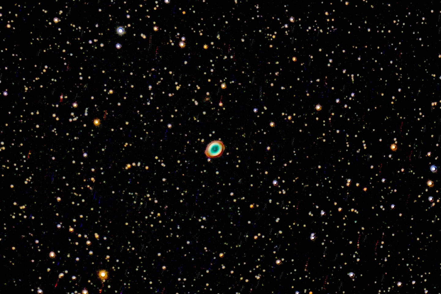 The Ring Nebula (also catalogued as Messier 57, M57 and NGC 6720) is a planetary nebula in the northern constellation oflyrsa. Such a nebula is formed when a star, during the last stages of its evolution before becoming a white dwarf, expels a vast luminous envelope of ionized gas into the surrounding interstellar space. History This nebula was discovered by the French astronomer Charles Messier while searching for comets in late January 1779. Messier's report of his independent discovery of Comet Bode reached fellow French astronomer Antoine Darquier de Pellepoix two weeks later, who then independently rediscovered the nebula while following the comet. Darquier later reported that it was "...as large as Jupiter and resembles a planet which is fading" (which may have contributed to the use of the persistent "planetary nebula" terminology). It would be entered into Messier's catalogue as the 57th object. Messier and German-born astronomer William Herschel speculated that the nebula was formed by multiple faint stars that were unresolvable with his telescope. In 1800, German Count Friedrich von Hahn announced that he had discovered the faint central star at the heart of the nebula a few years earlier. He also noted that the interior of the ring had undergone changes, and said he could no longer find the central star. In 1864, English amateur astronomer William Huggins examined the spectra of multiple nebulae, discovering that some of these objects, including M57, displayed the spectra of bright emission lines characteristic of fluorescing glowing gases. Huggins concluded that most planetary nebulae were not composed of unresolved stars, as had been previously suspected, but were nebulosities. The nebula was first photographed by the Hungarian astronomer Eugene von Gothard in 1886. Observation Location of the Ring Nebula in the constellationlyrsa M57 is found south of the bright star Vega, which forms the northwestern vertex of the Summer Triangle asterism. The nebula lies about 40% of the distance from Beta (ß) to Gamma (?)lyrsae, making it an easy target for amateur astronomers to find. The nebula disk has an angular size of 1.5 × 1 arcminutes, making it too small to be resolved with 10×50 binoculars. It is best observed using a telescope with an aperture of at least 20 cm (8 in), but even a 7.5 cm (3 in) telescope will reveal its elliptical ring shape. Using a UHC or OIII filter greatly enhances visual observation, particularly in light polluted areas. The interior hole can be resolved by a 10 cm (4 in) instrument at a magnification of 100×. Larger instruments will show a few darker zones on the eastern and western edges of the ring and some faint nebulosity inside the disk. The central star, at magnitude 14.8, is difficult to spot. Properties M57 is 0.787 kpc (2,570 light-years) from Earth. It has a visual magnitude of 8.8 and a dimmer photographic magnitude, of 9.7. Photographs taken over a period of 50 years show the rate of nebula expansion is roughly 1 arcsecond per century, which corresponds to spectroscopic observations as 20–30 km/s. M57 is illuminated by a central white dwarf of 15.75v visual magnitude. All the interior parts of this nebula have a blue-green tinge that is caused by the doubly ionized oxygen emission lines at 495.7 and 500.7 nm. These observed so-called "forbidden lines" occur only in conditions of very low density containing a few atoms per cubic centimeter. In the outer region of the ring, part of the reddish hue is caused by hydrogen emission at 656.3 nm, forming part of the Balmer series of lines. Forbidden lines of ionized nitrogen or N II contribute to the reddishness at 654.8 and 658.3 nm. Nebula structure M57 is of the class of such starburst nebulae known as bipolar, whose thick equatorial rings visibly extend the structure through its main axis of symmetry. It appears to be a prolate spheroid with strong concentrations of material along its equator. From Earth, the symmetrical axis is viewed at about 30°. Overall, the observed nebulosity has been currently estimated to be expanding for approximately 1,610 ± 240 years. Structural studies find this planetary nebula exhibits knots characterized by well-developed symmetry. However, these are only silhouettes visible against the background emission of the nebula's equatorial ring. M57 may include internal N II emission lines located at the knots' tips that face the central star; however, most of these knots are neutral and appear only in extinction lines. Their existence shows they are probably only located closer to the ionization front than those found in the Lupus planetary IC 4406. Some of the knots do exhibit well-developed tails which are often detectable in optical thickness from the visual spectrum. Central star The central star was discovered by Hungarian astronomer Jeno Gothard on September 1, 1886, from images taken at his observatory in Herény, near Szombathely. Within the last two thousand years, the central star of the Ring Nebula has left the asymptotic giant branch after exhausting its supply of hydrogen fuel. Thus it no longer produces its energy through nuclear fusion and, in evolutionary terms, it is now becoming a compact white dwarf star. The central star now consists primarily of carbon and oxygen with a thin outer envelope composed of lighter elements. Its mass is about 0.61–0.62 M?, with a surface temperature of 125,000±5,000 K. Currently it is 200 times more luminous than the Sun, but its apparent magnitude is only +15.75. In 2025 JWST observed a dust disk around the central star.