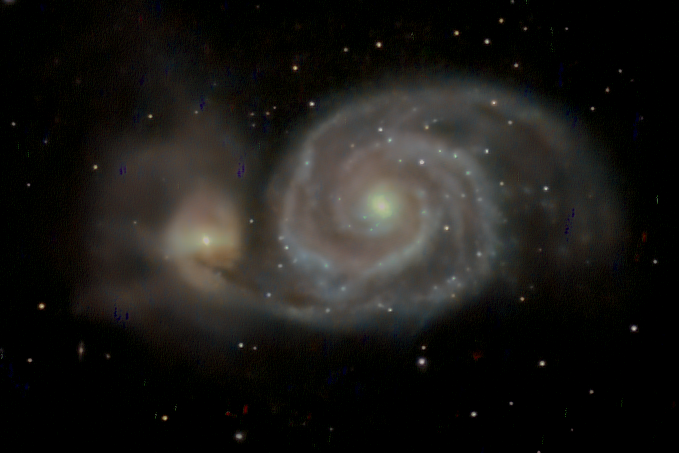 The Whirlpool Galaxy, also known as Messier 51a (M51a) or NGC 5194, is an interacting grand-design spiral galaxy with a Seyfert 2 active galactic nucleus. It lies in the constellation Canes Venatici, and was the first galaxy to be classified as a spiral galaxy. It is 31 million lightyears (9.5 megaparsecs/Mpc) away and 23.58 kiloparsecs (76,900 ly) in diameter. The galaxy and its companion, NGC 5195, are easily observed by amateur astronomers, and the two galaxies may be seen with binoculars. The Whirlpool Galaxy has been extensively observed by professional astronomers, who study it and its pair with dwarf galaxy NGC 5195 to understand galaxy structure (particularly structure associated with the spiral arms) and galaxy interactions. Its pair with NGC 5195 is among the most famous and relatively close interacting systems, and thus is a favorite subject of galaxy interaction models.