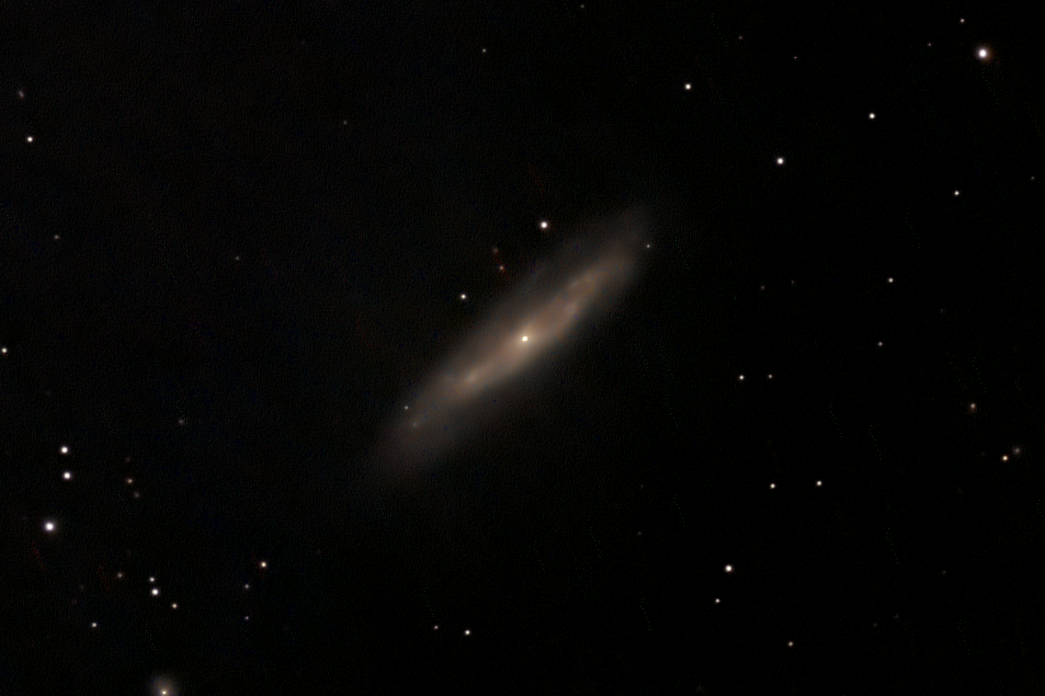 Messier 98, M98 or NGC 4192, is an intermediate spiral galaxy about 44.4 million light-years away in slightly northerly Coma Berenices, about 6° to the east of the bright star Denebola (Beta Leonis). It was discovered by French astronomer Pierre Méchain on 1781,[a] along with nearby M99 and M100, and was catalogued by compatriot Charles Messier 29 days later in his Catalogue des Nébuleuses & des amas d'Étoiles. It has a blueshift, denoting ignoring of its fast other movement (vectors of proper motion), it is approaching at about 140 km/s. The morphological classification of this galaxy is SAB(s)ab, which indicates it is a spiral galaxy that displays mixed barred and non-barred features with intermediate to tightly wound arms and no ring. It is highly inclined to the line of sight at an angle of 74° and has a maximum rotation velocity of 236 km/s. The combined mass of the stars in this galaxy is an estimated 76 billion (7.6 × 1010) times the mass of the Sun. It contains about 4.3 billion solar masses of neutral hydrogen and 85 million solar masses in dust. The nucleus is active, displaying characteristics of a "transition" type object. That is, it shows properties of a LINER-type galaxy intermixed with an H II region around the nucleus. Messier 98 is a member of the Virgo Cluster, which is a large cluster of galaxies, part of the local supercluster. About 750 million years ago, it may have interacted with the large spiral galaxy Messier 99. These are now separated by 1,300,000 ly .