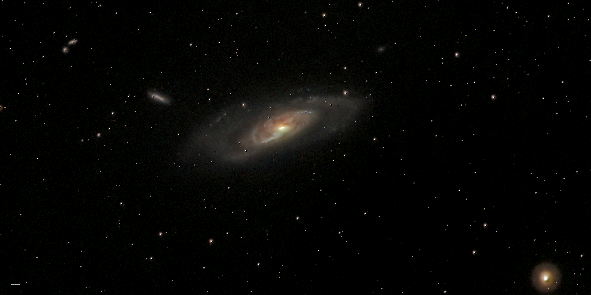 Messier 106 (also known as NGC 4258) is an intermediate spiral galaxy in the constellation Canes Venatici. It was discovered by Pierre Méchain in 1781. M106 is at a distance of about 22 to 25 million light-years away from Earth. M106 contains an active nucleus classified as a Type 2 Seyfert, and the presence of a central supermassive black hole has been demonstrated from radio-wavelength observations of the rotation of a disk of molecular gas orbiting within the inner light-year around the black hole. NGC 4217 is a possible companion galaxy of Messier 106. Besides the two visible arms, it has two "anomalous arms" detectable using an X-ray telescope. M106 has a water vapor mega-maser (the equivalent of a laser operating in microwave instead of visible light and on a galactic scale) that is seen by the 22-GHz line of ortho-H2O that evidences dense and warm molecular gas. Water masers are useful for observing nuclear accretion disks in active galaxies. The water masers in M106 enabled the first case of a direct measurement of the distance to a galaxy, thereby providing an independent anchor for the cosmic distance ladder. M106 has a slightly warped, thin, almost edge-on Keplerian disc which is on a subparsec scale. It surrounds a central area with mass 4×107 M?. It is one of the largest and brightest nearby galaxies, similar in size and luminosity to the Andromeda Galaxy. The supermassive black hole at the core has a mass of (3.9±0.1)×107 M?. M106 has also played an important role in calibrating the cosmic distance ladder. Before, Cepheid variables from other galaxies could not be used to measure distances since they cover ranges of metallicities different from the Milky Way's. M106 contains Cepheid variables similar to both the metallicities of the Milky Way and other galaxies' Cepheids. By measuring the distance of the Cepheids with metallicities similar to our galaxy, astronomers are able to recalibrate the other Cepheids with different metallicities, a key fundamental step in improving quantification of distances to other galaxies in the universe.