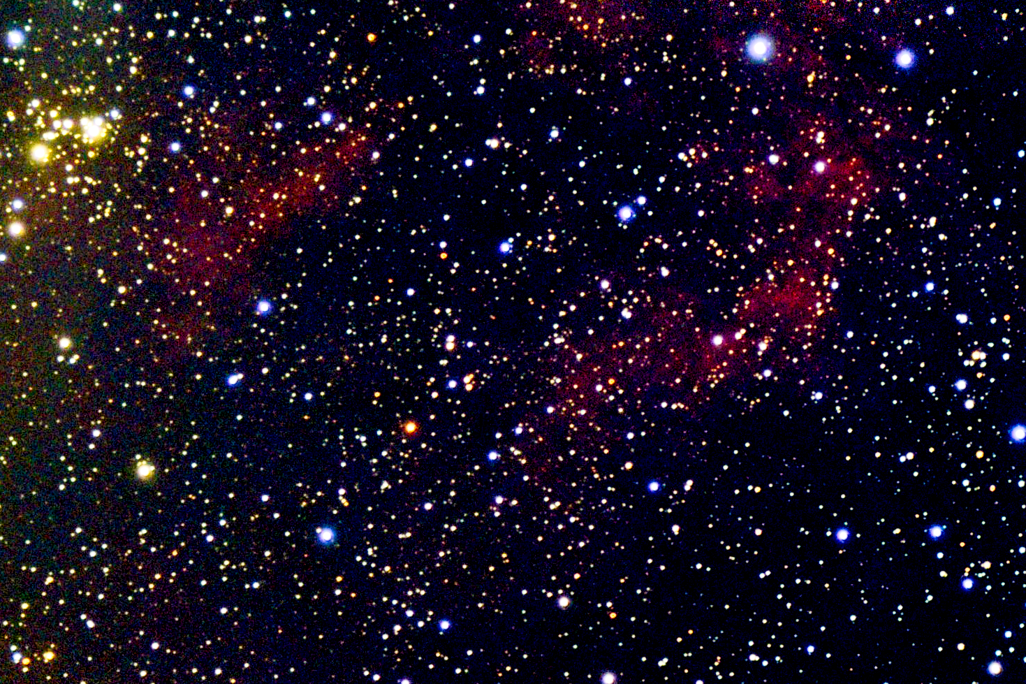 NGC 6910 is an open cluster in the constellation Cygnus. It was discovered by William Herschel on October 17, 1786. The cluster was also observed by John Herschel on September 18, 1828. It is a poor cluster with prominent central concentration and Trumpler class I2p. NGC 6910 is the core cluster of the stellar association Cygnus OB9. NGC 6910 is located half a degree east-north east of Gamma Cygni, also known as Sadr. It may be physically related with the nebula IC 1318 (also known as the Gamma Cygni Nebula) as it lies at a similar distance, behind the galactic Great Rift. Cygnus OB9 is located within the Orion Arm of the Milky Way. Cygnus OB9's dimensions in the sky are 2.5 degrees by 1.5 degrees, which corresponds at its distance to 175×105 light years across. It includes many OB stars, along with supergiant stars, like the red supergiant RW Cygni. Gamma Cygni is a foreground star, lying at a distance of approximately 1,500 light years. Because it lies behind a number of molecular clouds, the light from NGC 6910 is dimmed by more than one magnitude. The core radius of the cluster is 0.8 parsec (2.6 light years), while the tidal radius is 4.2 parsecs (13.7 light years) and represents the average outer limit of NGC 6910, beyond which a star is unlikely to remain gravitationally bound to the cluster core. 125 stars, probable members of the cluster, are located within the central part of the cluster, and 280 probable members are located within the angular radius of the cluster. The brightest apparent member of NGC 6910 is a blue supergiant HD 194279 (V2118 Cygni) with spectral type B2 and apparent magnitude 7.0. It is located at the southeast edge of the cluster. It is a variable star with P Cygni profile. A mag 8.1 star lies at the northwest edge of the cluster and a mag 8.5 O6 giant star (HD 229196, also known as V2245 Cygni) lies a bit southwest from the line connecting the two brightest stars. Other members of the cluster include two 10.3 mag stars, one being an O9.5 and the other a B0.5 main sequence stars. The star NGC 6910 37 is categorised based on its emission as a Be star and NGC 6910 14 and NGC 6910 25 are beta Cephei variables. In total there are four beta Cephei variables in the cluster, a rather high number. Their presence has been attributed to the higher metallicity of the cluster. Observing NGC 6910 Although visible via binoculars, the cluster is too compact to resolve in low power instruments. Individual stars can be seen with 15×100 binoculars. When seen in low magnification through a 5-inch telescope, the cluster looks like a crescent between the two brighter stars, while more powerful magnification reveals more stars forming streams extending to either side of the cluster.